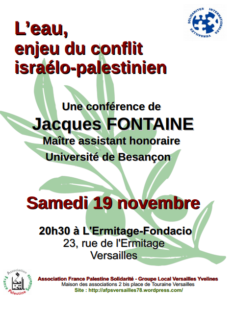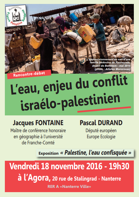 Les groupes AFPS de Nanterre et Versailles et Amitié Lille-Naplouse organisent des conférences sur la question de l’eau en Israël-Palestine, les 16, 18 et 19 novembre 2016.