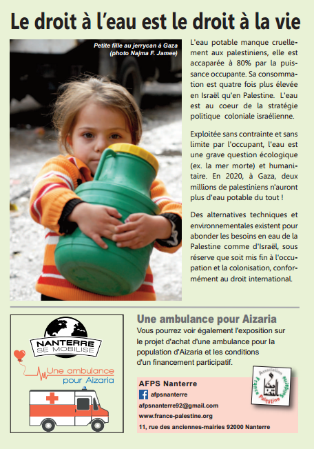 « L’eau en Palestine » : une conférence en présence d’Adelatheem Wadi, maire du village de Qusra (gouvernorat de Naplouse) proposée dans le cadre de la Semaine de la Solidarité Internationale par Amitié Lille Naplouse. Elle s’accompagnera d’une exposition du CCFD-Terre Solidaire 59.