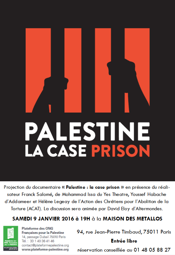 Le documentaire « Palestine : la case prison » est à nouveau projeté à la Maison des métallos le 9 janvier 2016 dans le cadre de son Focus Palestine, en présence de nombreuses personnalités palestiniennes et françaises !