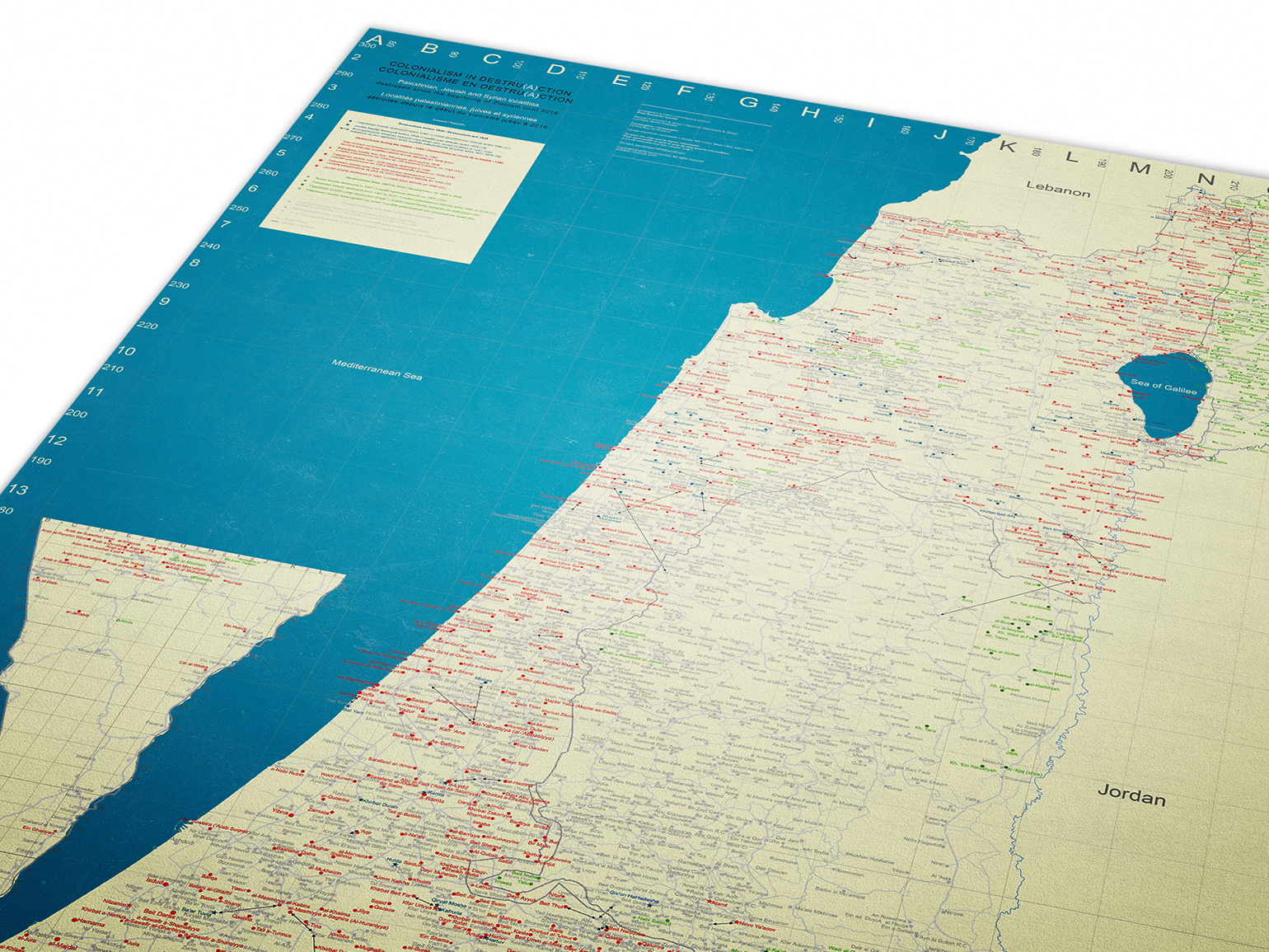 Le découpage par strates historiques (destructions pré-1948, pendant la Nakba et post-1948), répercuté visuellement par l’utilisation de trois couleurs de police sur la légende et sur la carte elle-même, montre le continuum historique de la persistance du projet colonial jusqu’à nos jours et le futur qu’il nous dessine s’il n’y a pas de mobilisation internationale substantielle pour exiger l’arrêt de la colonisation israélienne.