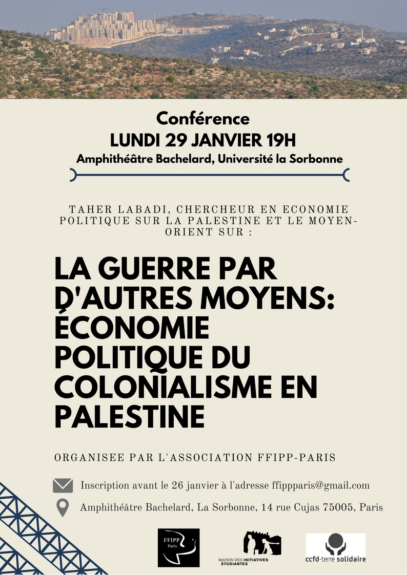Le FFIPP (Réseau académique de recherche et de dialogue sur le Proche-Orient) organise une conférence à la Sorbonne le lundi 29 janvier en autour de Taher Labadi sur le thème « La guerre par d’autres moyens : Economie politique du colonialisme en Palestine ».